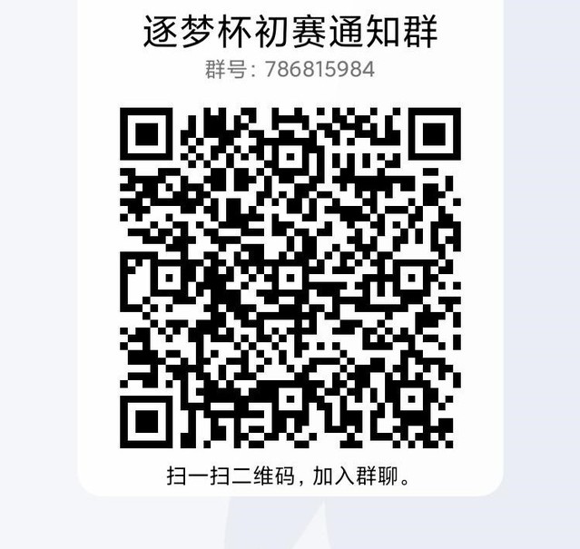 报名成功后记得扫描下方二维码加入群聊“逐梦杯初赛通知群”了解最新比赛通知。