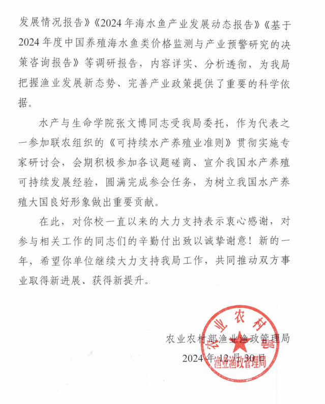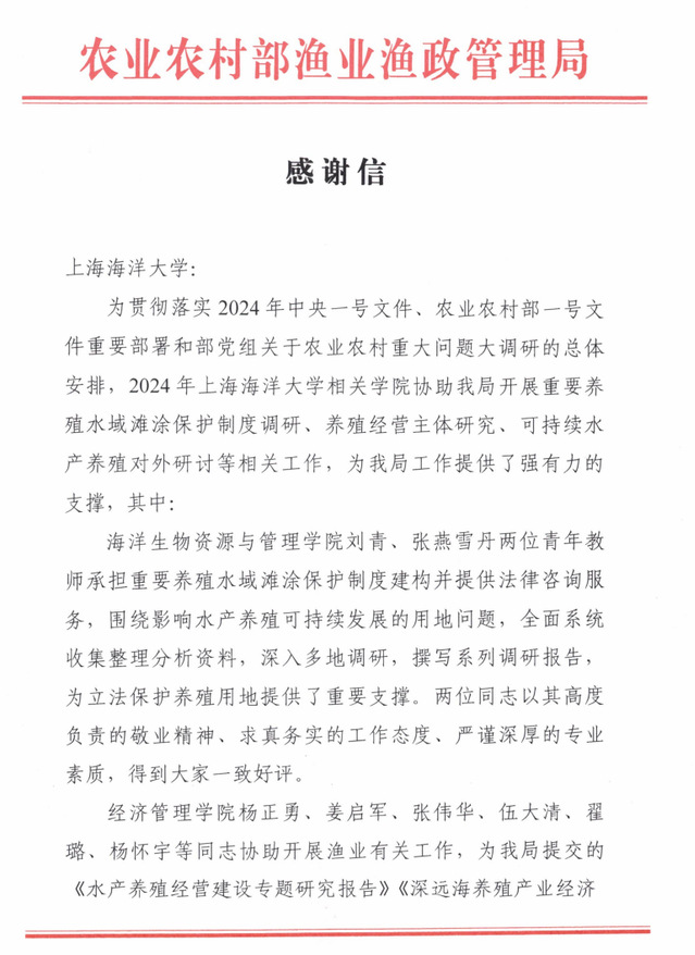 近日,学校收到农业农村部渔业渔政管理局发来的感谢信。感谢学校相关学院协助农业农村部渔业渔政管理局开展重要养殖水域滩涂保护制度调研、养殖经营主体研究、可持续水产养殖对外研讨等有关工作。对学校及新葡的京集团8814刘青、张燕雪丹同志,经济管理学院杨正勇、姜启军、张伟华、伍大清、翟璐、杨怀宇等同志以及水产与生命学院张文博同志一并表示感谢。