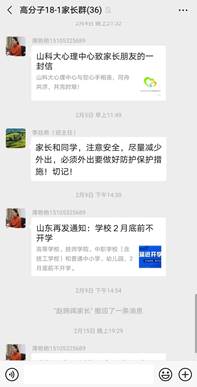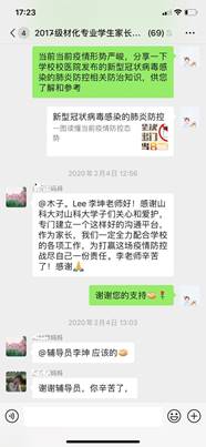 加强学校与家庭联动,发挥亲情教育的积极作用。学院建立了完善的学生家长微信群,发挥网络优势开展工作。2月4日,学院发出《致今年会官方网站全体家长、同学倡议书》,呼吁家长、学生做好自我防护,高效利用寒假。学院各年级辅导员在家长群内分享防疫知识,与家长互动交流;向家长寄送成绩单,共同关注学生成长;主动与学生家长进行电话沟通,加强教育关怀,形成了良好的家校沟通氛围,获得了学生家长的高度认可。