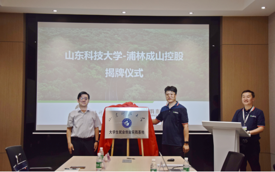 在浦林成山控股有限公司,学院与企业签订合作协议和捐赠协议,并为产学研基地、就业创业基地揭牌。