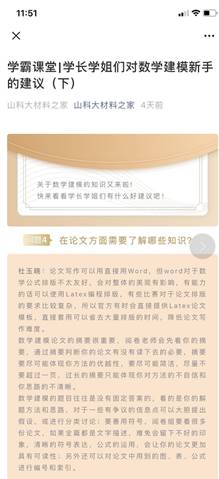 “学霸课堂”线上分享。针对部分学生有参加各类科技竞赛积极性,但却缺乏参赛经验的实际,学风建设部开展了 “学霸课堂”之科技竞赛知识线上科普活动。通过微信专题推送的形式,线上分享数学建模等比赛的流程、分类、注意事项等,并邀请有参赛经历同学分享心得体会,帮助同学们理清备赛思路。