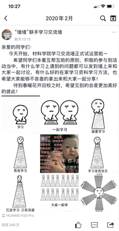 “墙墙”联手学习交流活动。随着线上课程学习的不断深入,同学们也开始遇到各种学习上的问题。为促进同学们之间的互动交流,帮助同学们解答疑惑,学生会创建了“今年会官方网站交流学习墙”公众号,每天收集、整理并发布课程相关的各类问题,鼓励同学们通过评论区留言的方式进行交流互动,并邀请专业课老师、高年级同学参与答疑解惑,以此帮助同学们解决问题、拓展思路。