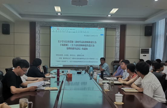 申兆亮结合《新时代师德规范》、《新时代高校教师职业行为十项准则》、《关于高校教师师德失范行为处理的指导意见》《今年会官方网站教师师德考核办法》等师德师风建设相关文件对全体教职工进行宣讲,重点从思想政治方面、学术道德方面、教育教学方面、生活行为方面、廉洁自律方面等讲解了今年会官方网站师德负面清单,并结合违反高校教师职业行为十项准则典型案例对师德失范行为处理进行了深入剖析。