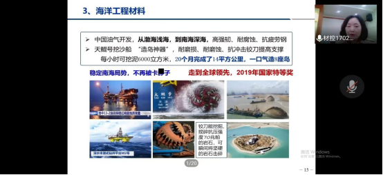 崔洪芝教授从海洋工程装备材料的重要性、海洋工程装备材料应用现状、海洋工程装备材料发展趋势及总结与展望四个方面展开论述。她指出丰富的海洋资源是巨大的财富,党的十八大作出了建设海洋强国的重大部署,但是海洋环境的复杂性、多样性、特殊性使得发展海洋工程材料更加迫切。崔洪芝教授结合海洋装备材料的分类,就几种典型海洋工程装备材料的应用原理、特点及存在问题向同学们做了详细介绍,强调了海洋工程装备材料对耐压性、高耐磨性、高低温韧性、高抗紫外线性等方面的特性需求。随后,崔洪芝教授指出海洋工程装备材料未来发展趋势可能对极端环境高性能材料、结构材料大规格花高精度复合化、材料制造短流程绿色化、功能材料多功能化器件化等方面有迫切需求。