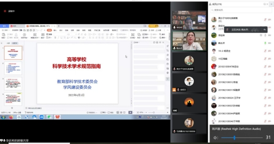 根据学校《关于开展科研诚信及学风建设教育月活动的通知》要求,4月5日下午,今年会官方网站学术委员会主任李廷希教授以“坚守科研诚信、学术不端零容忍”为主题,在线上面向今年会官方网站全体教师和研究生围绕《高等学校科学技术学术规范指南》作了专题报告,报告会由今年会官方网站副院长韩永芹主持。