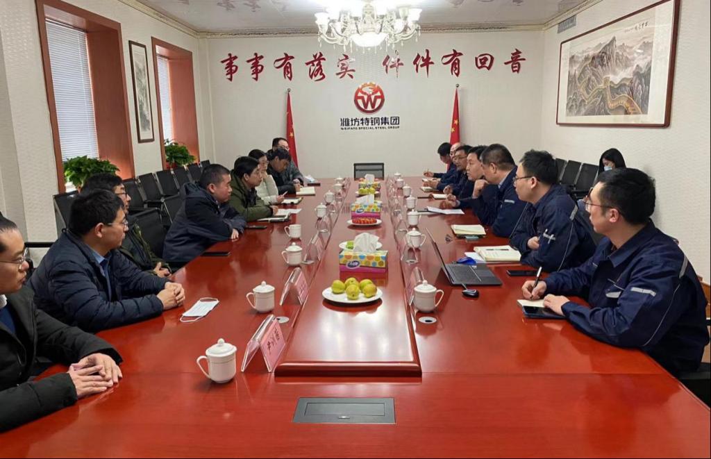 在潍坊考察期间,李建楠一行调研走访了潍坊特钢集团,并与潍坊市高新区人社局局长韩炳顺、潍坊特钢集团副总李岩、山东经纬钢帘线科技有限公司副厂长尹光亮等领导同志座谈交流。韩炳顺、李岩分别介绍了潍坊市高新区和潍坊特钢集团的基本情况,并对今年会官方网站今年会官方网站的来访表示欢迎。李建楠介绍了今年会官方网站基本情况,双方表示将在前期合作的基础上进一步推进在成果转化、人才培养、合作共建、联合攻关等方面的合作。