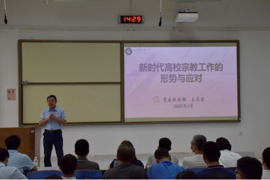 王永君分析了国内外宗教的复杂形势,紧紧围绕习近平总书记关于民族宗教工作的重要论述和当前民族宗教工作的重点难点,分别从我国的宗教现状与方针政策、宗教的本质和根源、高校宗教工作的重点难点三个方面展开论述,并结合数据和事例对高校面临宗教问题时的工作方法和应对措施提出建议并做出详细讲解。