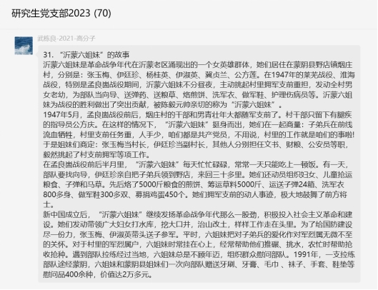 此次活动主题为“讲述英雄故事 传承红色基因”,同志们踊跃发言,积极分享革命英雄红色故事。“人民的好公仆——焦裕禄”、“铭刻胜利的投票箱”、“军民情深的见证—一只海螺号”等一个个鲜活的故事,让同志们深受教育和启发,深深的感受到今天的幸福生活来之不易。博士党员刘文涛主动将支部群里大家接力的红色故事进行了整理,方便同志们学习。