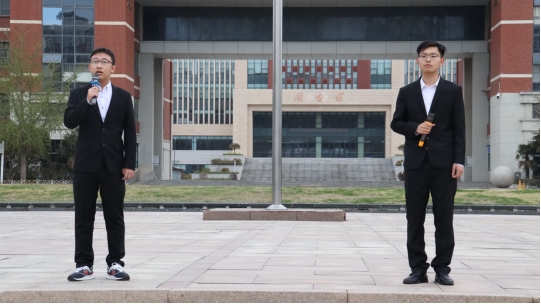 早晨6:20,升旗仪式正式开始。国旗护卫队队员迈着铿锵有力的步伐,护送五星红旗走向升旗台。在洪亮的国歌声中,展旗手将五星红旗奋力抛向天空。全体师生在冉冉升起的红旗下庄严肃立,向国旗行注目礼。接着,学生代表李华峰和李明泽在国旗下激情朗诵《我们的青春》,以跨时代对话的形式向我们展示了属于不同时代青年人的奋斗与担当。他们的朗诵让同学们认识到应以实际行动回报、奉献社会,以美好青春为底色,将伟大民族复兴当作心中蓝图,紧跟党走,不负青春韶华,勇担时代使命。