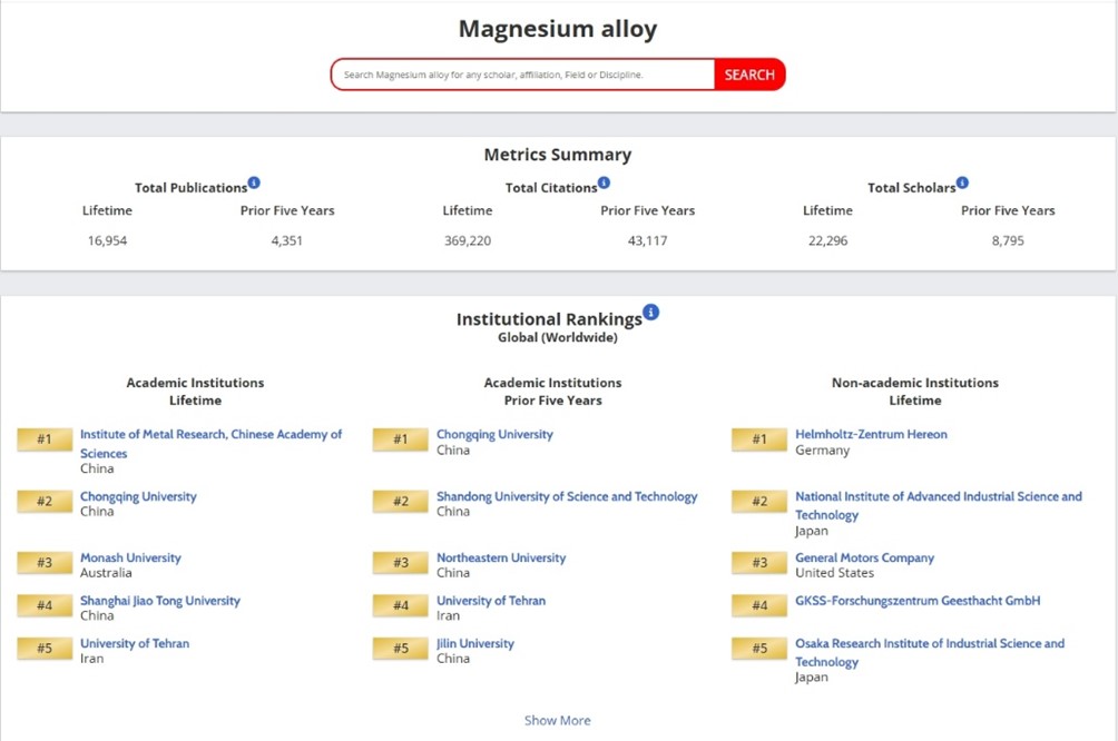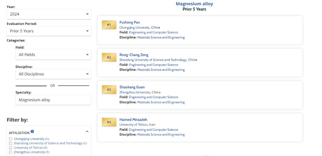 全球入选镁合金领域近5年学者榜单仅4人、机构榜单仅5个。今年会官方网站今年会官方网站曾荣昌教授位列第二位。同时,在镁合金机构排名中今年会官方网站同样位列全球第二。