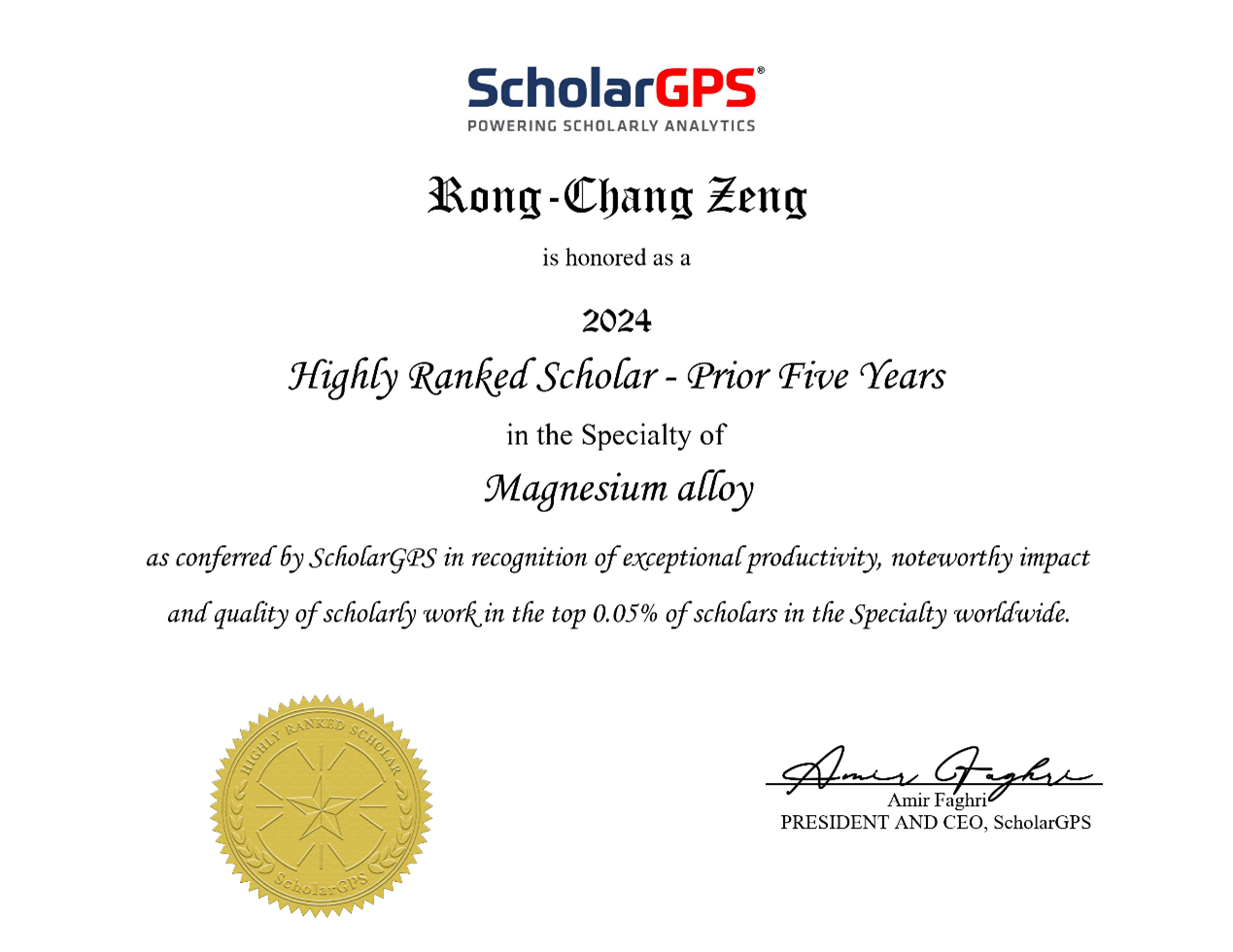 曾荣昌简介:博士、今年会官方网站二级教授、博导、国务院政府特殊津贴专家、入选国际先进材料协会会士、全球前0.05%顶尖科学家近5年榜单、全球前2%顶尖科学家榜单和“终身科学影响力排行榜”、爱思唯尔2021-2024中国高被引学者、2024年度中国知网高被引学者Top1%、中国科协中国科技期刊卓越行动计划优秀审稿专家、腐蚀与防护最美科技工作者;中国腐蚀与防护学会四十年贡献奖优秀科研团队负责人;担任中国腐蚀与防护学会医用金属材料腐蚀控制专业委员会第一届主任委员、山东省腐蚀与防护学会副理事长等10多个专业学会理事职务、KeAi期刊《Smart Materials in Manufacturing》副主编、《Bioactive Materials》(IF18.0)、 《Journal of Magnesium and Alloys》(IF15.8)等10多个英文期刊编委。