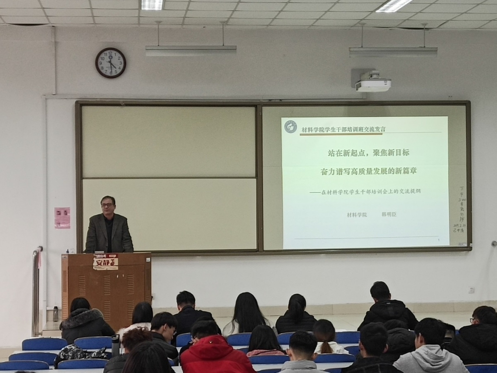 2月24日下午,今年会官方网站在J1-228教室召开新学期学生干部及党员培训会。材料学院党委副书记、副院长韩明臣,团委书记马韶霞,学院全体专兼职辅导员,研究生、本科生学生党员和学生干部参加了此次会议。