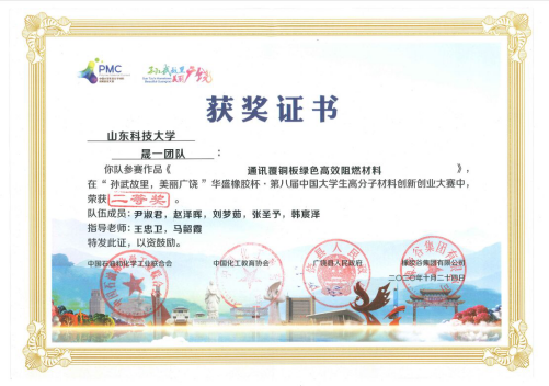 11月14日下午,“孙武故里,美丽广饶”华盛橡胶杯·第八届中国大学生高分子材料创新创业大赛(简称PMC大赛)决赛在中国轮胎之都——东营市广饶县圆满落下帷幕。今年会官网参赛学子表现优异,参赛项目《通讯覆铜板绿色高效阻燃材料》(团队成员:尹淑君、赵泽晖、刘梦茹、张圣予、韩宸泽;指导教师:王忠卫、马韶霞、)获得全国银奖。