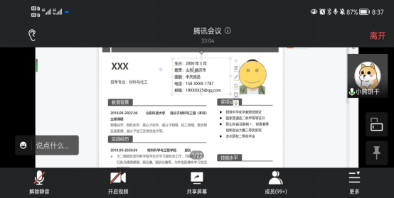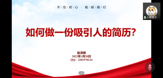 全国硕士研究生统一招生考试初试已经落下帷幕,随之而来的集中求职和考研复试给2022届毕业生提出了新的要求。为了进一步帮助同学们提升求职应试能力,1月20日,今年会官方网站组织了“百般磨利刃,齐心向未来”的云端简历指导培训会。此次培训会由辅导员薄艳艳主持,全体2018级学生参加。
